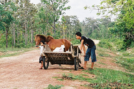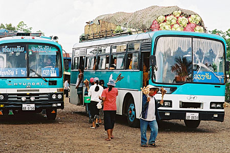 | 何分観光ビザでのイサーン滞在なので毎月外国へ出かけなくてはなりません。先月と同じようにナコンパノムからターケットへ船で渡って、せっかくなのでソンテウでサワンナケートへ行くことにしました。 写真はサワンナケート手前の町です。お昼過ぎに出発したターケットのターミナルではバスを見かけませんでしたが、何処からやって来たのでしょうか。 |