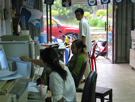 | 散策中雨が土砂降りなったのでネットカフェに逃げ込みました。映っているのは店の人たち。奥の部屋でバックパカー風の旅行者が数人インターネットに興じていました。ここのパソコン、日本語の読み書きが出来ます。 |
