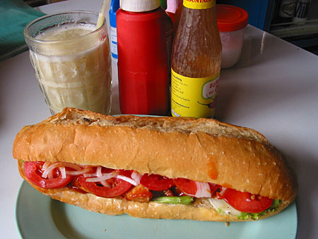 | ビザ更新目的の消極的な旅ですが、せっかくラオに来たからにはサンドイッチを食べたくなります。バックパッカーが出没する街だけあって国際的な味がしました。 |