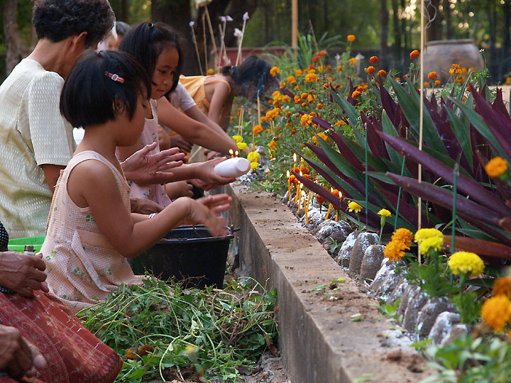 泥で土台を作ってから花やロウソクを供えます。ベビーパウダーで見た目を整えロウソクに火を灯してから家族の幸せを祈ります。土台は家族の人数分だけ作るそうです。とても静かな夕暮れでした。