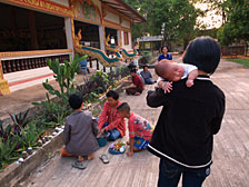 | 3月最後の日曜日の夕方、家の人にお寺に連れて行かれました。生後2ヶ月の赤ちゃんをお参りに来ていた女の子に任せ母親は儀式の準備を、父親は何事とが始まるのかと興味深気に写真ばかり撮っていました。