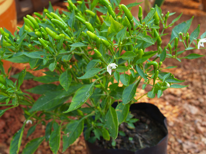 子供達に手伝ってもらって出来た花の小屋に飾るため唐辛子の苗を買って来ました。とても小さな花と実をつけていました。帰りがけによった市場では巨大な唐辛子を見つけました。