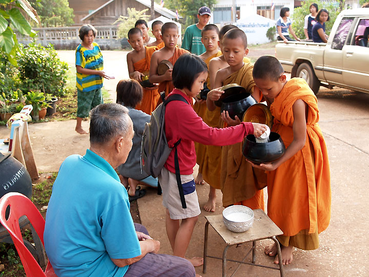 ノンヒー村でも托鉢は毎朝行われております。 いつもはお坊さん一人で周っていますが今朝は小僧さんが沢山やって来ました。 近くの村から遠征して来たそうです。修業というより研修というような雰囲気でした。