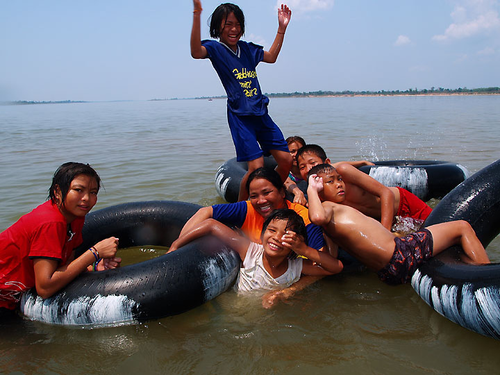 ソンクラーンも終わり誰も水をかけてくれないのでタートパノムまで泳ぎに行きました。 浅瀬の水は心地よくなかなか結構なメコン日和でした。 写真は偶然現地で一緒になったノンヒー村の皆さん、後ろに映っている緑の川辺はラオスです。