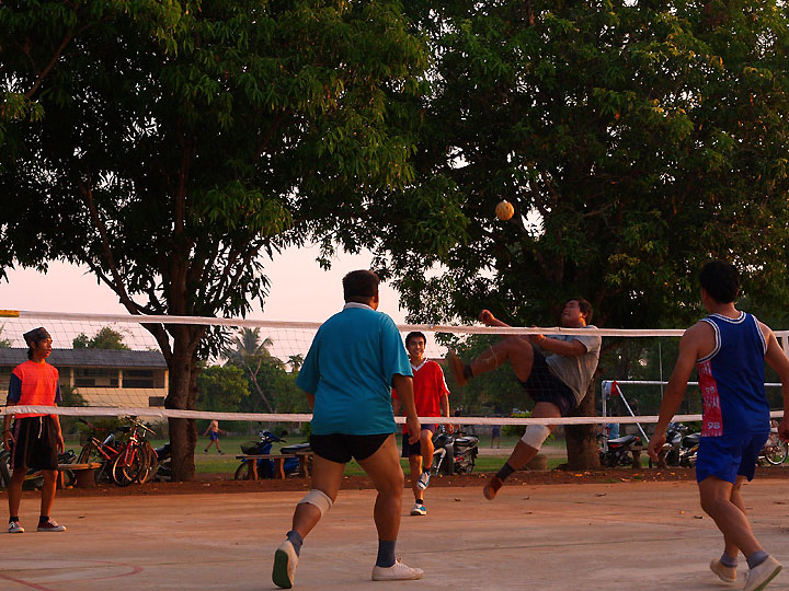 今小学校は夏休みですが、授業があろうとなかろうと夕方になると 毎日のように校庭の隅のコートでタックローをやっています。 今日は学校の裏の森で筍を掘った帰りに見物して来ました。 若い人もそうでない人も 結構真剣にプレーしていました。それでもとても楽しそうでした。