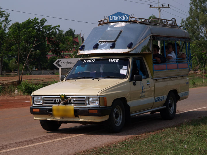 ソンテウに乗ってナコンパノムに行ってきました。 運賃はガソリンの値上がりに伴い5バーツ高くなって25バーツです。 ナコンパノムまでは1時間ほどかかります。 退屈な旅の中で乗って遊ぶ分には楽しいのですが、 ちょとした買い物のために利用するには結構しんどい乗り物です。