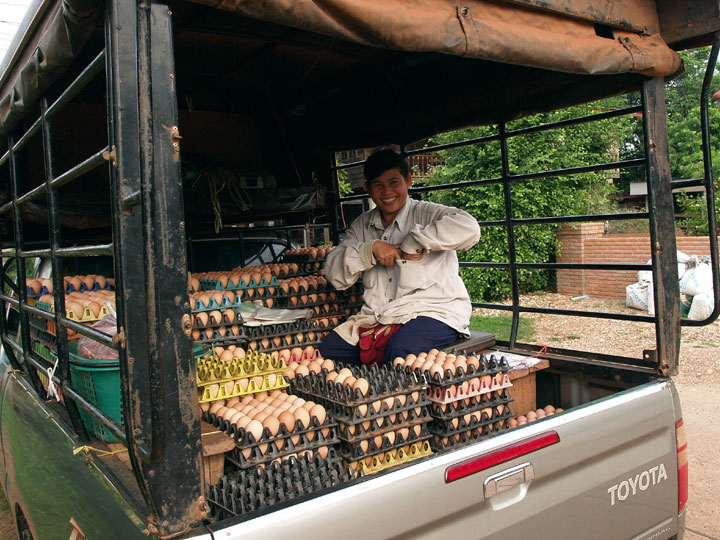 毎週火曜と木曜の朝卵屋さんの車が周ってきます。 日本のスーパーなら高級品扱いされそうな色付きのザラザラした卵を売っています。 ここでは白い卵はあまりみかけません。 お値段一つ3バーツ、9円ほどですからそう安くもないような気がしますが、 それでも卸売り価格だそうです。