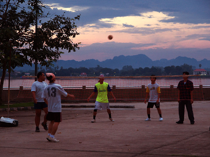 もうそろそろ雨季も明ける頃ですが降ったり止んだりの天候が続いております。 夕方メコン沿いに散歩に出かけました。 町で一二の高級ホテルの間にある錆びれた公園ではタックローをしたり 這うようにジョギングする人達が夕暮れのメコンを楽しんでいました。