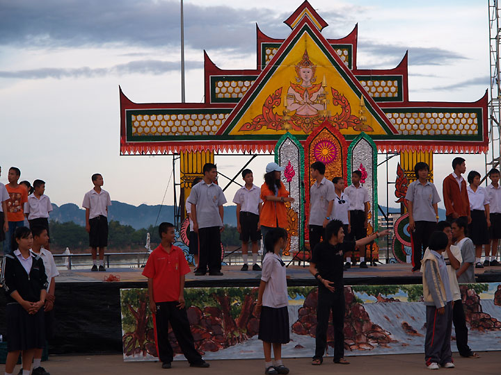 この頃日課のようになっている夕方の メコン沿いの散歩、今日は特設されたステージで 学生さん達が何やら予行練習をしているところを見物しました。 本番はいつで何をするのか知りませんが賑やかなものです。 ノンヒー村だとメイン会場のお寺が祭りの全てだったりするのですが、 流石に県庁がある街、色んな所で色んな催し物があるようです。