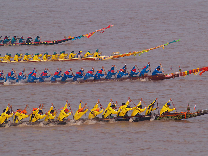 | 決勝レースのスタート直後です。 残念ながらスタート地点からゴールの様子は 貨物港の出っ張りで見えません。 運営スタッフらしき舟が引き上げて来るのを見て これが最終レースだと知りました。 力強い漕ぎっぷりに魅入られた3日間でした。 撤収作業をするメコン沿いを眺めながら帰りました。 ゴール地点に着いた時には、 青いユニホームの選手達が表彰されておりました。 | |