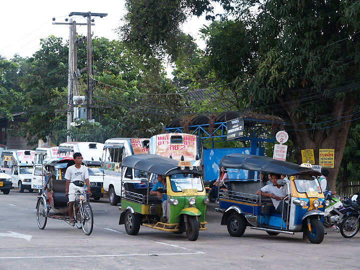 ピーマイの遺跡祭り、スリンの象祭りを見に行くため 朝7時のバスに乗りウボンラチャタニーへ、 更に列車に乗り代え夜の7時にコラートヘ着きました。 イサーン内の移動は場合によってはバンコクへ出るよりも時間と労力を要します。 写真はウボンの駅前、列車を待つため4時間近くここでぼうっとしてました。 ナコンパノムとはトゥクトゥクの形が違いとても遠くまで来た気分になりました。