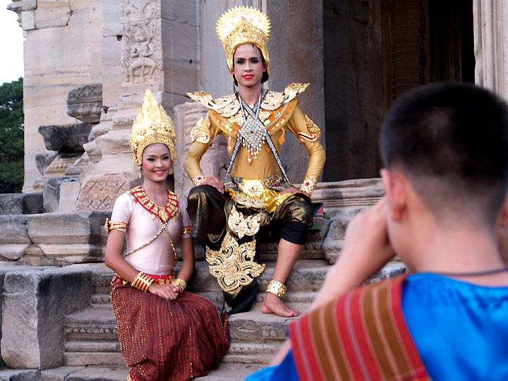 | 朝コラートのTATで祭りのスケジュールを聞いて 午後ピーマイへ。 本番は明日からだけど今日はショーのテスト公演が 安く(100バーツ)見られるとのこと、 夕方会場の遺跡へ行ってみると出演する学生さん達が 記念写真を撮っていたので便乗させてもらいました。 ショーは7時くらいから始まりました。 はるばるやって来た割にはショー自体に期待はしていなかったのですが、 とても見応えありました。 | |