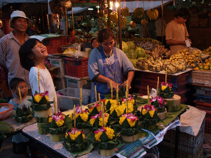 午後となり街のシーコラプーム遺跡を見物して夕方スリンにもどると 市場はカトーン(灯篭)売りで賑わっていました。 とても綺麗だったのでレンズを向けると ファインダーの外で女の子が派手に てれておりました。 折角なのでズームを引いて撮りました。 明日はローイカトーンです。