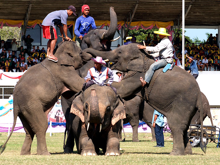 スリンに来て3日目になりますが、象祭りは明日からです。 待ち切れずショーが行われる会場に行ってみると 予行演習していました。 関係者以外立ち入り禁止とか堅苦しいことを 言うわれることもなく見物も撮影も自由にさせて貰えました。 演技を終えた象から順に会場を出て街に営業に繰り出していました。