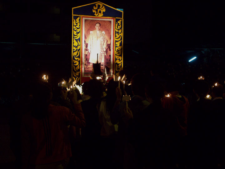 今日は国王誕生日、父の日です。 バンコクではさぞ華やかな式典が 催されたことと思います。 遠く離れた国境沿いのこの街でも花火が打ち上げられました。 県庁前ではイベントがあったそうでうが、 うちの近くのホテルでも従業員の方や近所の人が お祝いに集まりロウソクに火を灯していました。