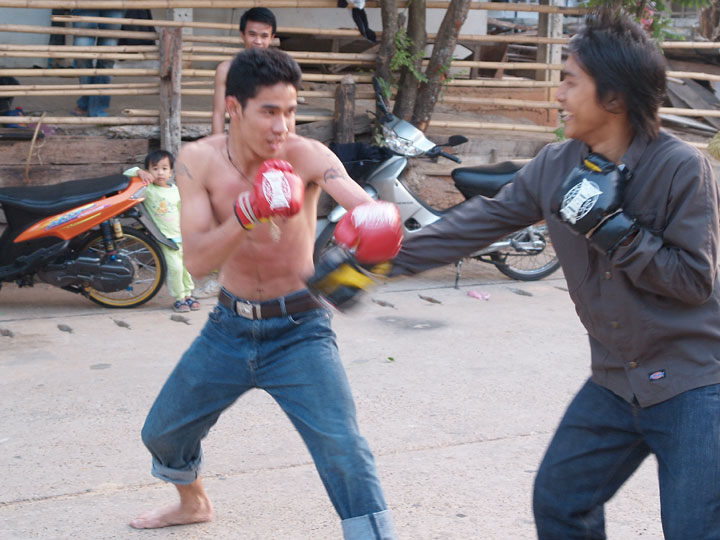 隣の家の前で若いもんらがボクシングをしてました。 足は使ってなかったのでムエタイではないようです。 レンズを向けると照れて笑っていましたがなかなか様になっていました。 やってみるかと誘われましたが痛そうだったのでメコンへ散歩に行きました。 帰ってきてもまだボコボコ殴りあっていました。
