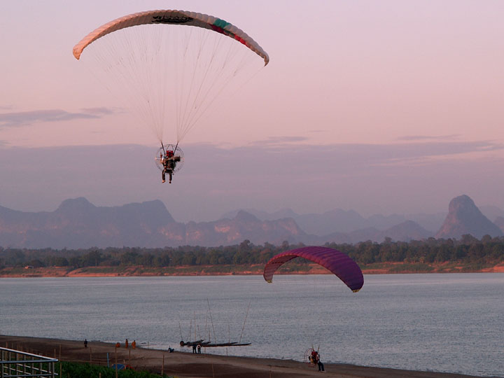 夕方庭でタバコをすっていると上空から草刈機のような音が聞こえて来ました。 何事かと見上げると人が浮かんでいました。 メコンの方に向かっていたのでカメラと赤ちゃんを持って追いかけました。 珍しげに写真を撮っていると近くにいた見物人がタイ訛りの英単語で パラメターだと教えてくれました。 まるで自分が空を飛んでいるような自慢げな顔をしてました。