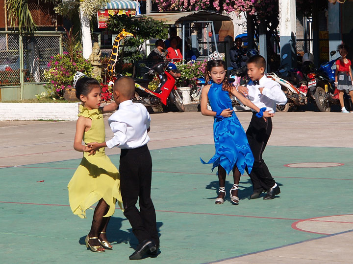 | 今日パレードをした学校には知人が夫婦で 先生をしているので見物に行き、 パレードが運動会のようなものではなく 運動会の中の種目にパレードがあるのだと知りました。 行進して学校に戻るとゲームやダンスが始まりました。 一際目を引いたのは社交ダンス。 グランドは狭くコンクリートでも それなりの見せ場があるものだと感心してしまいました。 | |