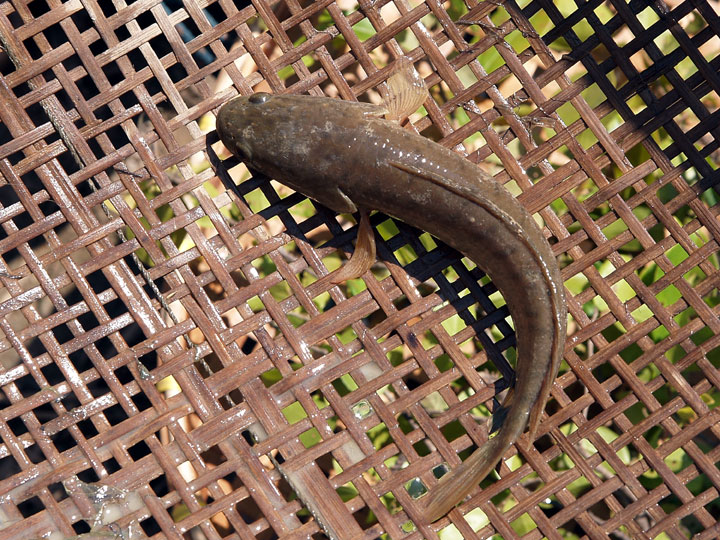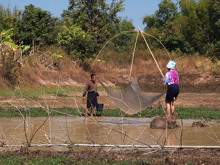 ノンヒー村に遊びに行きました。 うらの畑の湿地でタムさん親子が魚獲りをしてました。 雨季の間に溜まった水が丁度いい具合に引いていて 今が収穫時期なのだそうです。 お玉じゃくしなら分かりますが、 毎年雨水に魚が湧いてくるのは何とも不思議な気がします。 狙いは小魚で腐らせて臭い調味料を作るそうです。 10cm以上あるのが網にかかることもあるのですが それは焼いて食べるそうです。