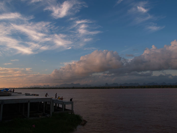 | 4月のソンクラーン・水掛祭りにここへ来た時にはメコンの底が見えていましたが、 数ヶ月に渡る雨期によってすっかり水を蓄えていました。 まだ雨期は明けておらず、こちらへ移ってきてからも振ったりやんだりの天気が続いてます。 そんな中夕方ぱっと晴れたのでメコン沿いを散歩しました。 遊歩道は充分整備されていると思うのですが、まだ気がすまないのか、 コンクリートを川岸に延ばす工事をしていました。 工事現場には立ち入り禁止の札もなく、 竣工前であろうがなかろうが、そこでまったりしている人達の姿がいかにも この国らしいような気がします。 | ||