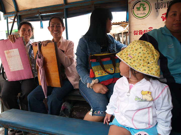 ナコンパノム発、ナーケー行きソンテウ。他人の子を見て笑っているのは宝くじの売り子さんです。 この路線ではよく見かけます。途中の村に宝くじ販売員養成所でもあるのかも知れません。 それにしてもよく肥えた子供ですね。