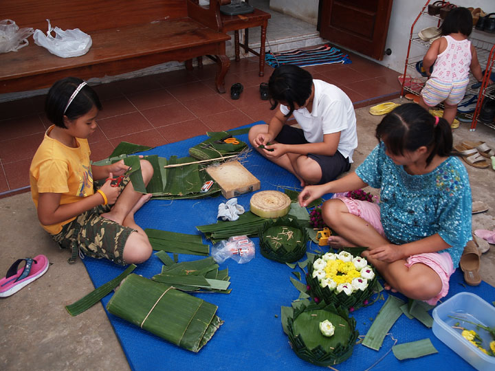 何の役にもたちませんでした。仕方がないのでカトーン(灯篭)だけ撮りました。 土台はバナナの木の幹で出来ています。飾りもバナナの葉っぱです。 我が家でもカァちゃんが近所に押しかけて製作しました。 自分の家ですると後片付けが面倒なのだそうです。 | ||